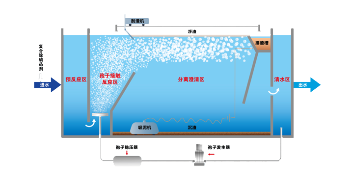 孢子轉(zhuǎn)移技術(shù),是將混凝技術(shù)、氣浮技術(shù)與微納米孢子相結(jié)合,通過定制化藥劑、微納米氣泡與水中的磷、疏水基懸浮物發(fā)生反應(yīng),創(chuàng)新形成的一種高效物理化學(xué)處理方法。主要解決了目前常用溶氣氣浮技術(shù)在應(yīng)用過程中存在的處理效率較差、表面負(fù)荷較低、處理能耗較高、應(yīng)急機(jī)動(dòng)性不強(qiáng)等問題。